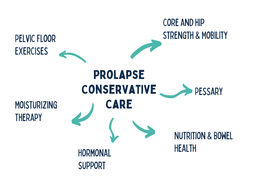 Pelvic Floor Exercises: Research has shown that pelvic floor exercises (kegels) alone can improve 44% of pelvic organ prolapse symptoms and incontinence can improve by 62%.